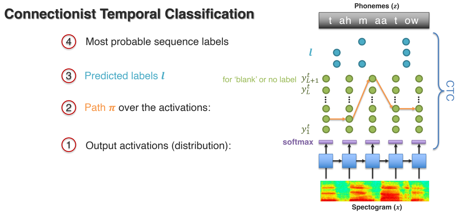 - 레이블이 없는 연속 신호(예: 스펙트로그램)에 대해, “이 구간은 음소 ‘t’, 이 구간은 ‘a’”처럼 정확한 구분선을 제공하지 않아도, CTC가 가장 그럴듯한 분할(세그멘테이션) + 레이블링을 찾아냄.