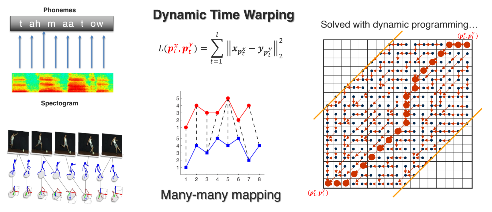 - 두 시퀀스$(x^{T}, y^{T})$가 길이가 다를 때, 최소 비용(distance) 를 갖는 mapping 을 찾아내어 정렬(워핑)하는 알고리즘