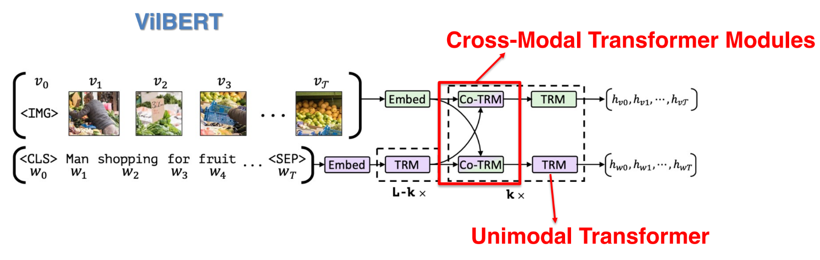 ViLBERT (Lu et al., 2019)은 시각(이미지) 모달리티와 언어(텍스트) 모달리티를 분리된 두 스트림(두 개의 Unimodal Transformer)으로 먼저 처리한 뒤, Cross-Modal Transformer Modules에서 서로 교차로 정보를 주고받으며 정렬(align)하는 구조를 가진다.