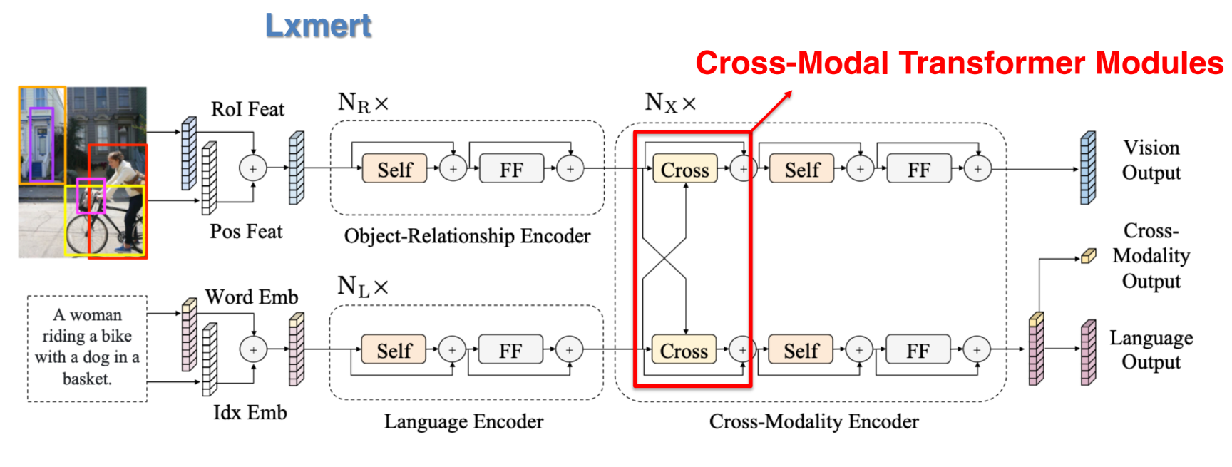 LXMERT (Tan et al., 2019) 역시, Language Encoder와 Object-Relationship Encoder(이미지 객체 관계를 처리하는 인코더)를 각각 사용한 뒤, Cross-Modality Encoder에서 두 모달리티를 합친다.