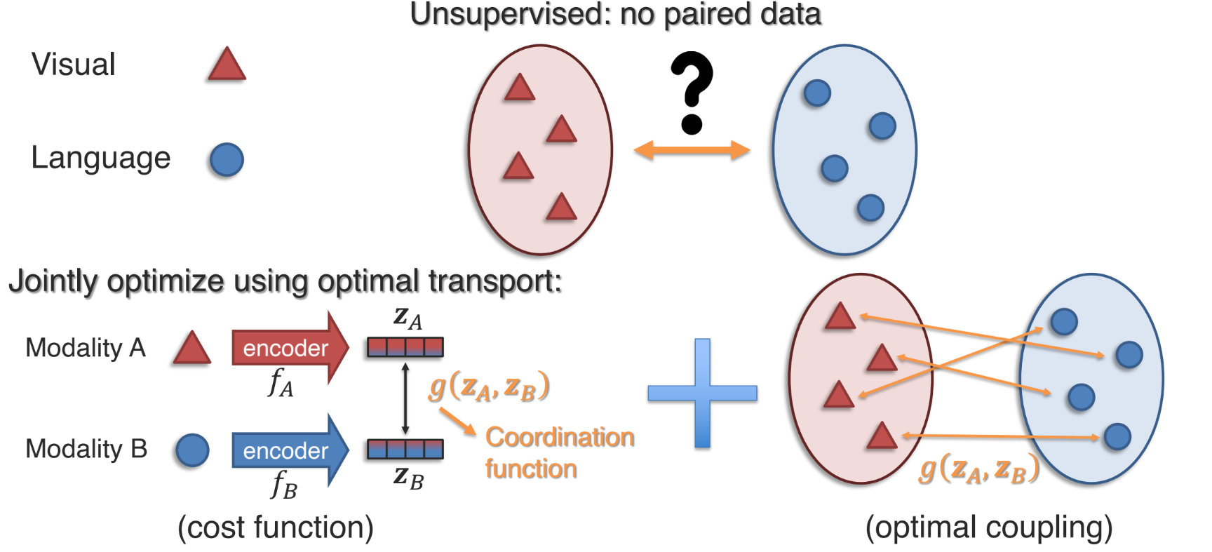 - 즉, $z_{A}, z_{B}$를 잇는 “연결선(커플링)”의 가중치를 최적화해 분포 간 차이를 최소화한다.