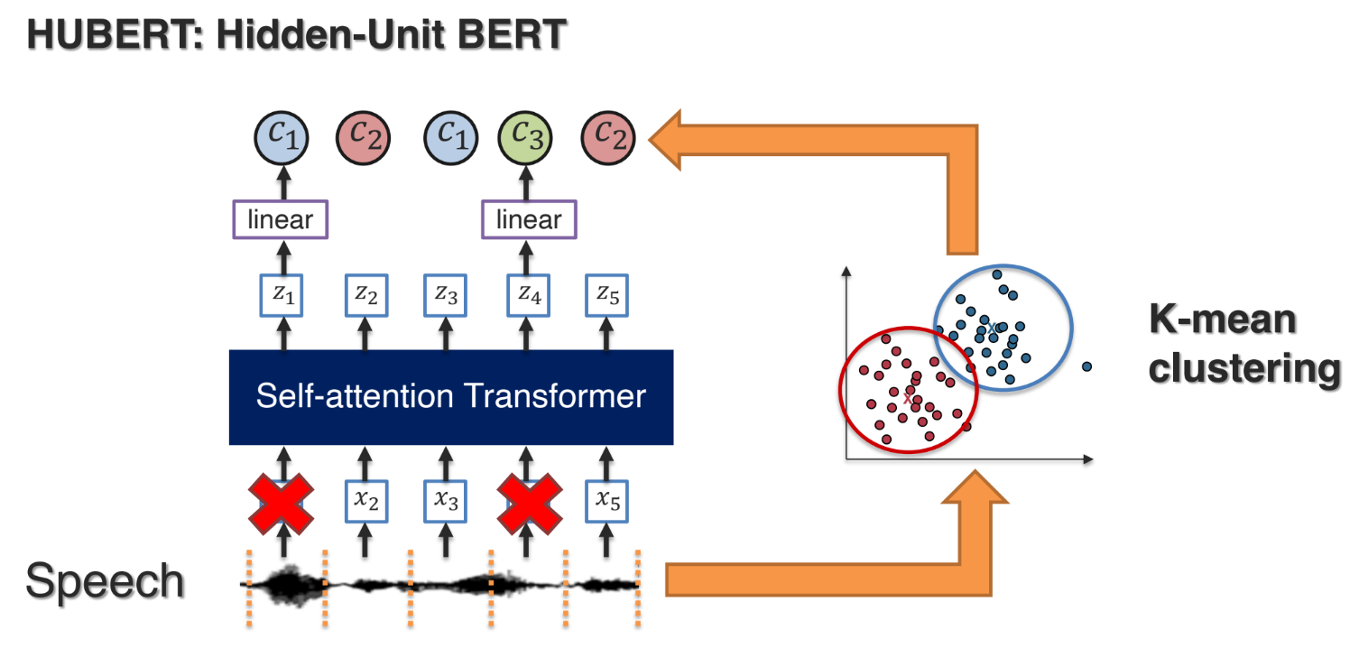- Masking & Prediction: 마치 BERT가 단어를 마스킹하고 예측하듯, 음성 프레임 일부를 마스킹하고, 모델이 해당 클러스터 레이블을 예측하도록 학습