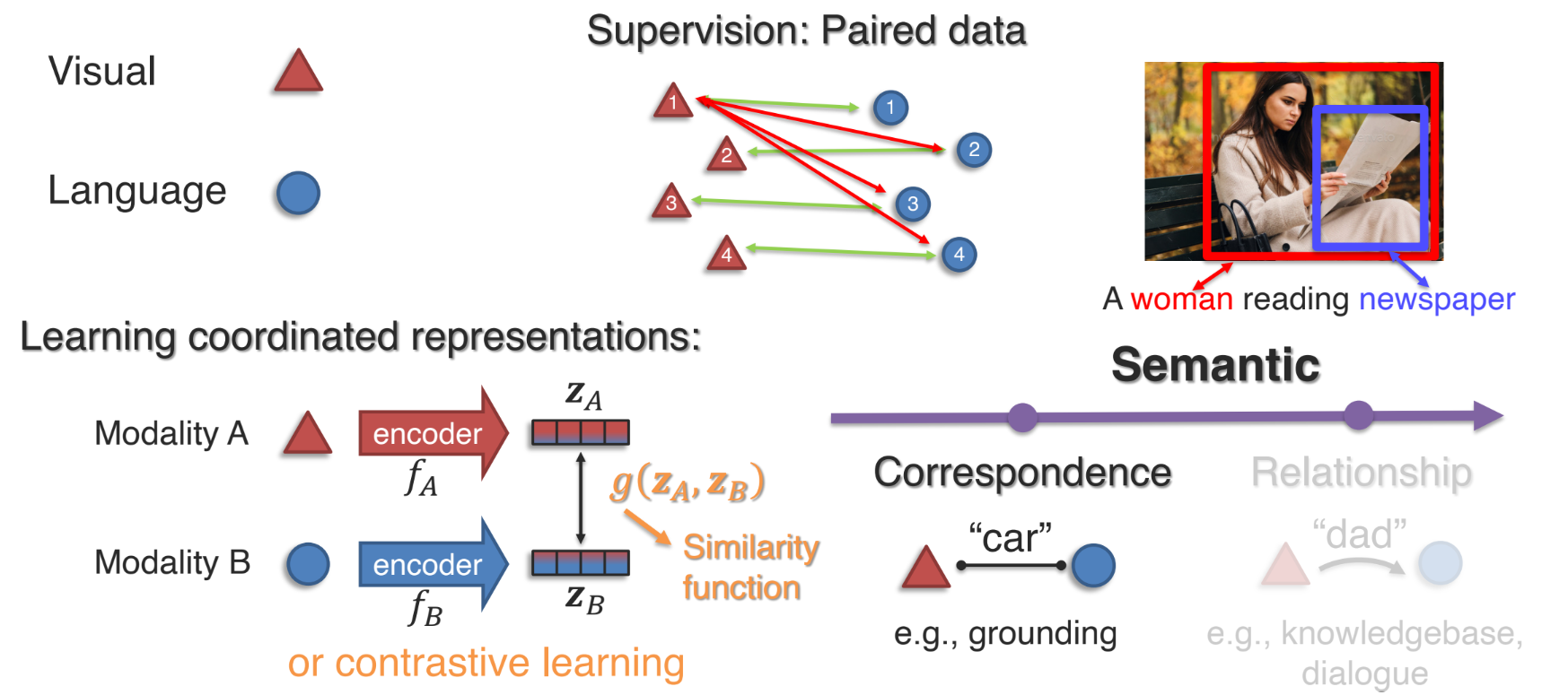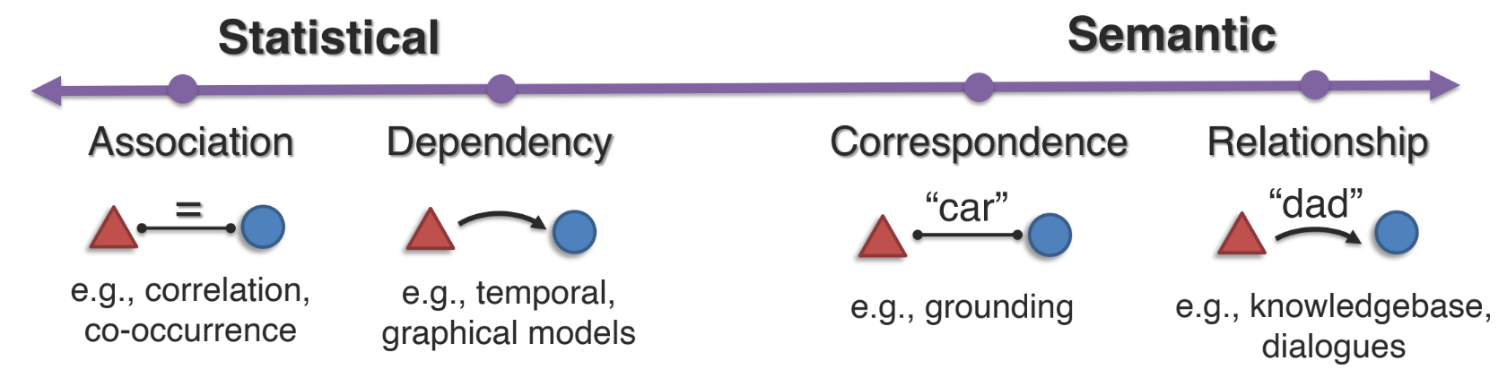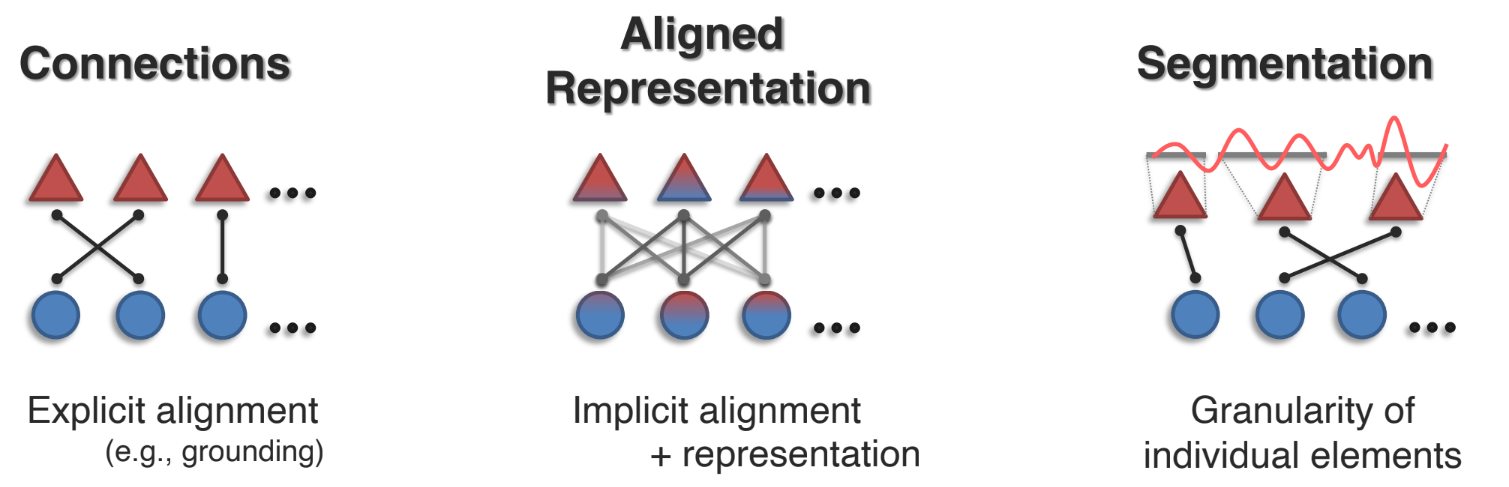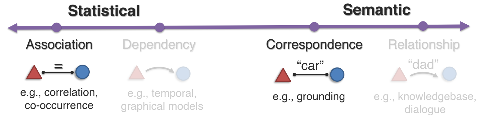 - 서로 다른 모달리티에 존재하는 여러 element 사이에 connection 을 어떻게 식별하고 모델링할 것인지를 다룬다.