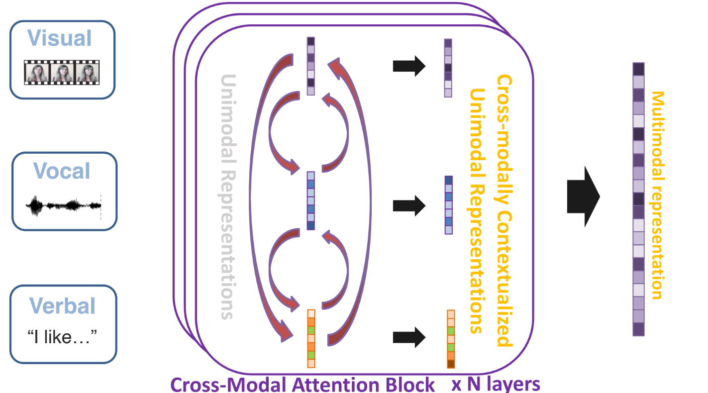- 여러 모달리티(Visual, Vocal, Verbal)가 각각 Unimodal Representations(각 모달리티 전용 인코더)를 거쳐서 1차 표현을 만듦.