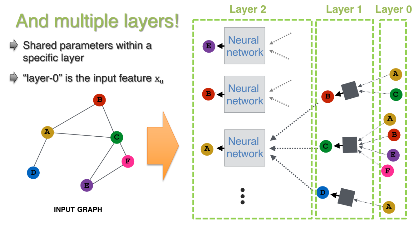 - Layer 2, 3, …: 계속해서 더 넓은 범위의 이웃 정보를 통합하여, 점차 풍부한 노드 표현을 얻음.