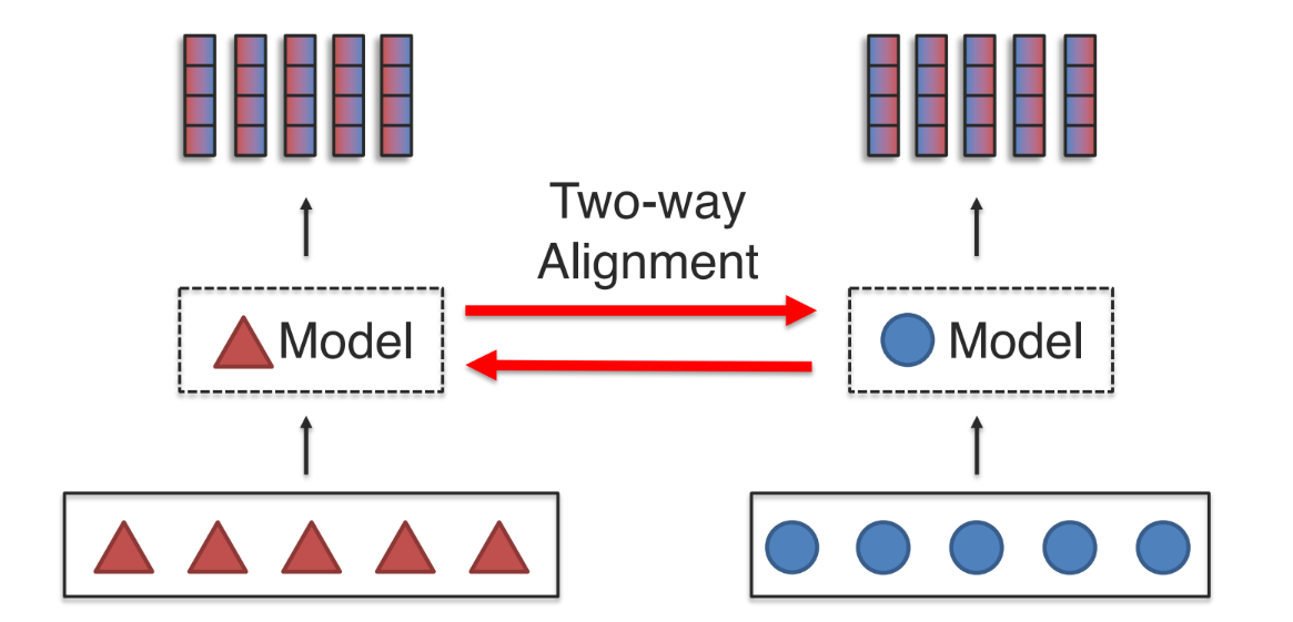 - 두 모달리티(예: 텍스트 모델, 이미지 모델)가 서로 양방향으로 정보를 주고받으며 정렬(align)되는 개념을 보여줌.