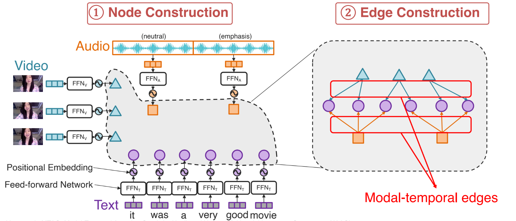 - Modal edges: 같은 모달리티 내에서, 시간적으로 인접한 노드들을 연결(예: 텍스트 단어 간 연결, 비디오 프레임 간 연결, 오디오 프레임 간 연결).