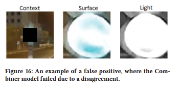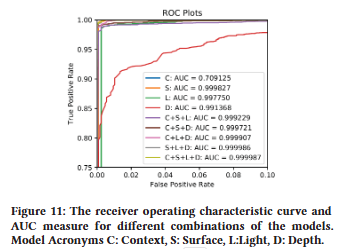 위의 Figure 11에서 Context, Surface, Light, Depth 모델의 조합에 대한 receiver operating characteristic (ROC) 플롯과 ROC 아래 영역 (AUC)을 제시하며, 여기서 네 가지 모두의 조합이 제안된 모델이다. ROC는 모든 가능한 예측 임계값에 대한 true positive rate (TPR) 및 false positive rate (FPR)을 보여주고, AUC는 분류기의 전체 성능 측정값을 제공한다 (AUC=1 : 완벽한 예측, AUC=0.5. : 임의 추측).