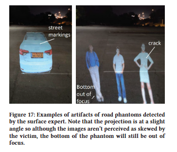 - 도로에 투영될 때(충돌을 유발하기 위해) 이미지는 표면으로 인해 비정상적인 텍스처와 색상 패턴을 받게 된다. 예를 들어 하수구, 균열, 도로 표시 및 아스팔트가 모두 투영된 이미지를 왜곡한다(아래 Figure 17 참조). 도로 표지판과 신호등이 벽 및 기타 수직 표면에 투영될 때도 마찬가지이다.