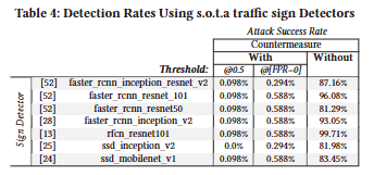 이 countermeasure 를 7가지 최신 road sign detector 들에 적용했을 때, 우리 모듈이 없을 때의 공격 성공률이 99.7%에서 81.2% 사이였던 것이, 논문의 모듈을 사용하면 0.01%로 감소하였다.