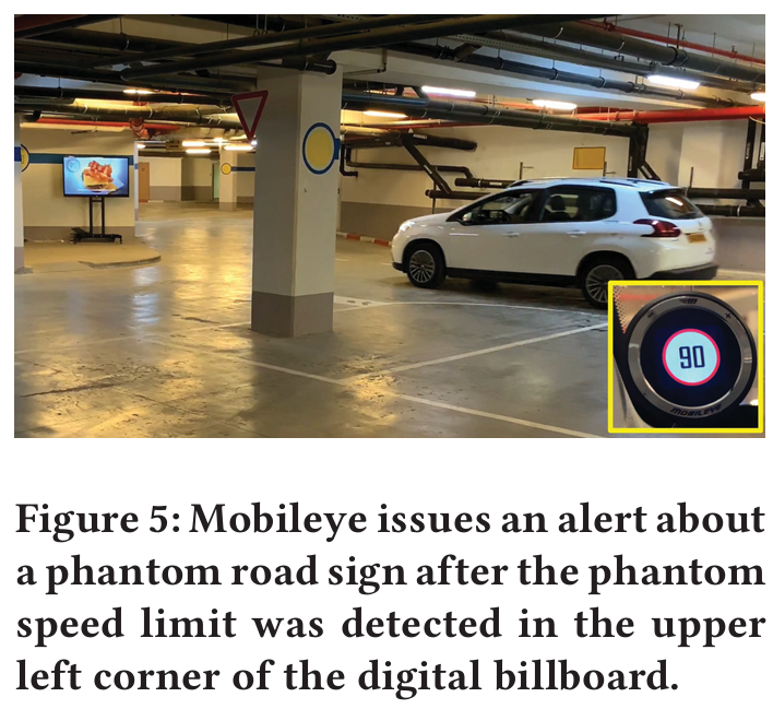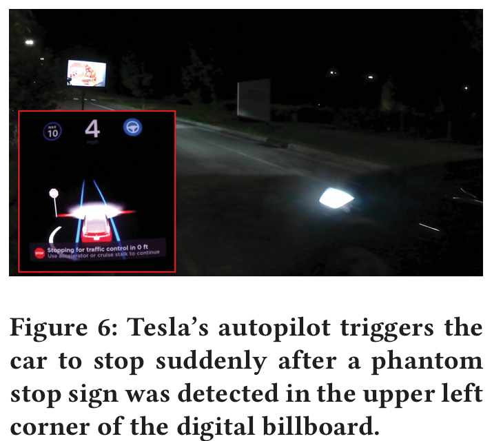 원격에 있는 attacker 가 phantom road sign 을 광고로 embedding 해서 split-second phantom attack 을 할 수 있다. 이는 Tesla 의 autopilot 이 갑자기 차량을 road 한 가운데에 멈추도록 하고, Mobileye 630 이 가짜 알림을 발행하도록 한다.