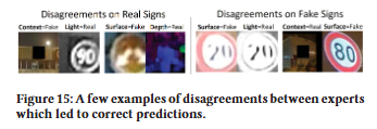 Figure 15에서 Combined 모델에 의한 올바른 예측을 초래한 불일치의 몇 가지 시각적 예를 제공한다. 경우에 따라 증거가 있더라도 모델이 단순히 잘못 분류한다. 예를 들어, 때때로 Context 모델은 표지판이 트럭 뒤쪽에 있다는 것을 인식하지 못한다 (Fig. 15의 오른쪽 하단 모서리). 다른 경우에는 모델의 관점에 필요한 증거가 없기 때문에 오분류한다. 예를 들어, 때때로 Context 모델은 표지판이 수평 구조물 위에 떠 있는 것을 비정상적으로 생각한다 (Figure. 15의 왼쪽 상단 모서리). 그럼에도 불구하고, 모든 경우에 다른 모델들이 잘못된 의견과는 반대로 강력한 신뢰 투표를 제공하여 올바른 예측을 이끌어 냈다.