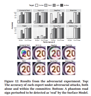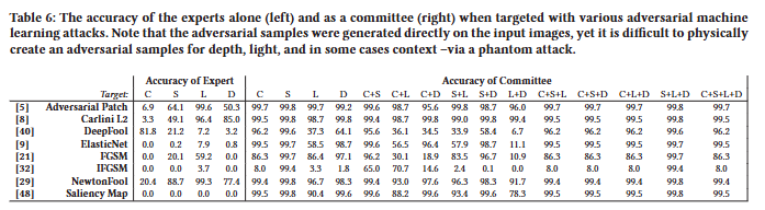 한 가지 예외는 Surface 모델을 타겟팅하는 경우를 제외하고 위원회의 결정에 부정적인 영향을 미치는 IFGSM 방법이다. 그러나 예를 들어 [ 14 , 16, 30 , 37 , 38, 41 , 63 ]과 같이 IFGSM 공격을 구체적으로 완화하는 많은 연구가 있다. 그럼에도 불구하고 adversarial 공격은 고양이와 쥐 게임이며 솔루션이 향후 adversarial 공격에 영향을 받지 않는 것은 아니라는 점에 유의하는 것이 중요하다. 그러나 이러한 결과는 공격자가 (1) 복잡한 물리적 특징(예: 빛과 깊이)을 만들어야 하고, (2) 공격을 수행할 수 있는 위치(context)가 제한되고, (3) 여러 물리적 측면(전문가)을 한 번에 캡처하는 adversarial sample을 생성해야 하기 때문에 위원회 접근 방식이 공격자에게 어려움의 기준을 높인다는 것을 나타낸다.