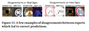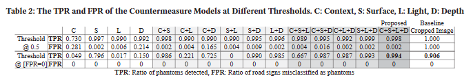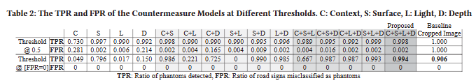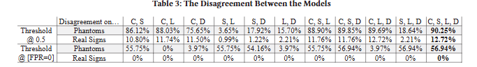 네 가지 모델의 조합이 최상의 결과를 제공하므로 각 측면(컨텍스트, 표면, 빛, 깊이)이 실제 교통 표지판과 팬텀 교통 표지판의 차이에 대한 고유하고 중요한 관점을 제공한다는 분명한 징후이다. 몇 가지 경우를 제외하고 각 모델이 고유한 기여를 한다는 추가 증거는 Table 2에서 확인할 수 있다. 여기서 모든 모델 쌍이 단일 모델보다 낫고 모든 세 쌍둥이가 모든 쌍보다 낫다. 전문가 위원회 접근 방식이 효과적이려면 모델 간에 약간의 의견 불일치가 있어야 하므로 이는 중요하다.