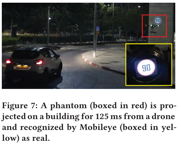 도시 환경 내에서 차량이 주행하는 동안, 드론은 Mobileye의 시야 내에 있는 한 건물에 125ms 동안 90 km/h 속도 제한 표지판의 팬텀을 투사하였다. 위의 Figure 7은 이 실험에 사용된 팬텀의 스냅샷을 보여준다. Mobileye가 팬텀을 감지하고 운전자에게 90 km/h 속도 제한을 알림으로써 공격은 성공적이었다.