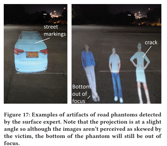 또한, attacker 가 projector 를 사용해서 road 에 phantom (가상의) 보행자를 projection 해서 Tesla 의 autopilot 이 이에 반응하여 brake 를 밟도록 하고, Mobileye 630은 project 된 road sign 에 반응하여 거짓 알림을 발행하도록 한다.