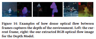 - 이미지에서 보이는 장면의 깊이(거리)를 input 으로 받는다.이를 얻기 위해 $x^t$와 마지막 프레임의 동일한 공간$(x^{t-1})$ 사이의 optical flow를 계산한다. Optical flow는 2D 벡터 필드이며, 각 벡터는 픽셀 변위를 캡처한다.