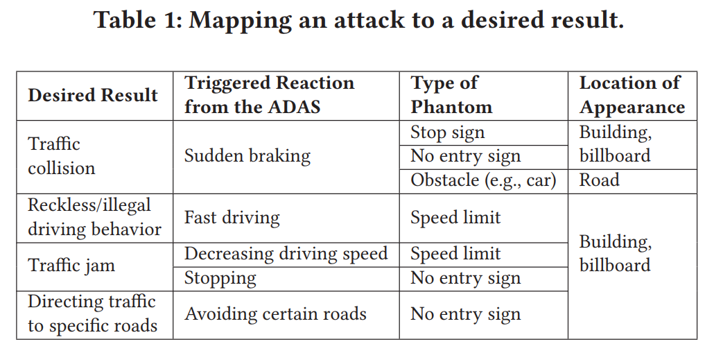 연구진들은 phantom 은 깊이가 없는 시각적 객체로 정의한다. 이는 ADASs 를 속이기 위해 사용되고 ADAS 가 객체를 인식하고 진짜라고 생각하도록 한다. Phandom 객체는 projector 가 생성하거나 digital screen (e.g., billboard) 통해 보여진다. 깊이가 없는 객체는 3D 객체(보행자, 차량, 트럭, 오토바이, 교통 신호 등)의 사진으로부터 만들어진다. Phantom 은 ADAS 로부터 바람직하지 않은 반응을 촉발하기 위해 의도된다. 자율주행 0단계 ADAS 의 경우에, 반응은 event (e.g., 허용된 최대 속도) 에 대한 운전자 알림이나 알람(e.g., 충돌 회피)가 될 수 있고, 자율주행 2단계 ADAS 의 경우에는, phantom 은 차량으로부터 자동의 위험한 반응(e.g., 급제동) 을 촉발할 수 있다. Split-second phantom attack 은 ADAS 가 아주 짧은 시간동안 나타나는 phantom 을 실제 객체/장애물로 오인하도록 하는 attack 이다. 왜 ADAS 가 split-second phantom attack 에 취약한지에 대한 2가지 이유가 있다.