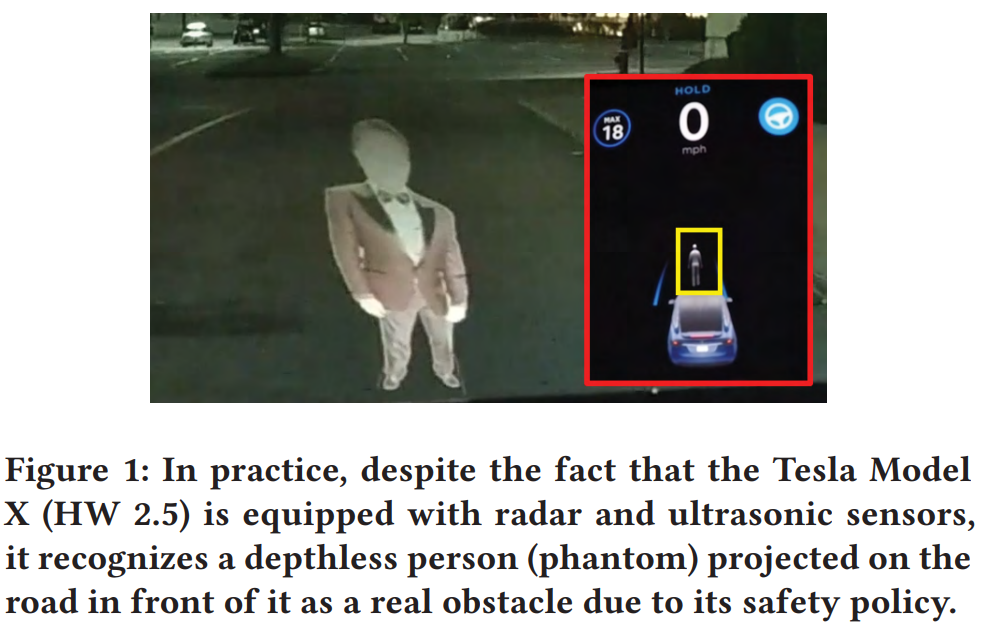 - Disagreement between sensors (센서 간 불일치) : phantom 은 센서 퓨전을 사용하는 AI 모델에서 발생하는 엣지 케이스로, 비디오 카메라를 통해 탐지된 장애물과 다른 거리(depth) 센서들이 완전히 불일치할 때 나타난다. 이러한 상황에서 Tesla 는 레이더 입력보다 영상(카메라) 입력을 우선 신뢰하며, 깊이 정보가 없는 투영되거나 제시된 객체라도 실제 장애물로 간주한다. 여기에는 몇몇 이유들이 있다.