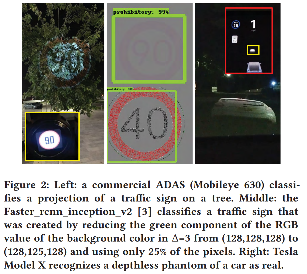 - Perceptual weakness (지각적 약점) : Phantom 은 computer vision 알고리즘의 인지를 어렵게 한다. 왜냐하면, 이러한 알고리즘은 개인적인 경험과 진위성, 인간이 고려하는 다른 요인들에 기반하여 결정을 하기 때문이다. 대부분 알고리즘은 실제 객체로 구성된 dataset 을 사용해 수행되는 training 단계의 output 이다. 결과적으로, computer vision 알고리즘은 phantom 을 식별해서 이들을 무시하도록 train 되지 않는다. 대신에, 이러한 알고리즘들은 객체의 일부분(e.g., 모서리, 윤곽) 이 training example 들과 유사하다면 높은 신뢰도를 가지고 객체를 분류한다. 특히 이러한 알고리즘들은 아래 3가지 측면을 고려하지 않는다.