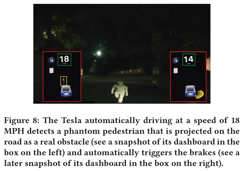 또한, attacker 가 projector 를 사용해서 road 에 phantom (가상의) 보행자를 projection 해서 Tesla 의 autopilot 이 이에 반응하여 brake 를 밟도록 하고, Mobileye 630은 project 된 road sign 에 반응하여 거짓 알림을 발행하도록 한다.