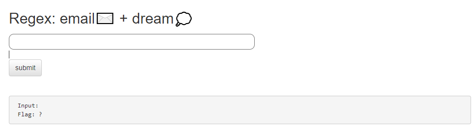 Regex : email + dream과 같은 정보를 통해 정규 표현식에 관한 웹임을 알 수 있고, 무언가를 입력하고 submit 하면 input에 따른 Flag를 얻을 수 있음을 알 수 있다.