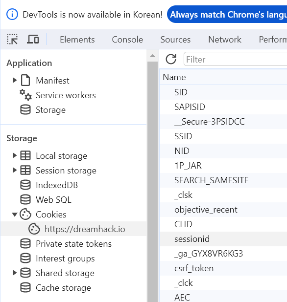 여기서, sessionid를 delete하고 새로 고침을 하면 로그아웃이 되어있는 것을 확인할 수 있으며, sessionid를 다시 입력하고 새로 고침 하면 로그인되어 있음을 확인할 수 있다.