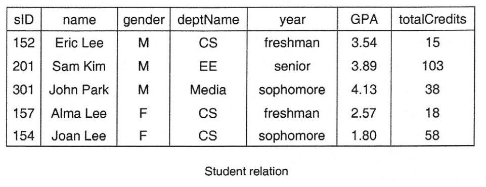 예를 들면, Student라는 개체 존재하고, sID(학번), name(이름), totalCredit(총수강학점수) 속성(attribute)을 갖는다.