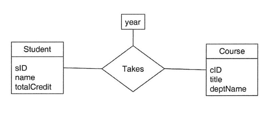 이는 Course라는 개체와 "학생이 과목을 수강한다"라는 의미의 Takes 관계성(relationship)이 존재한다.