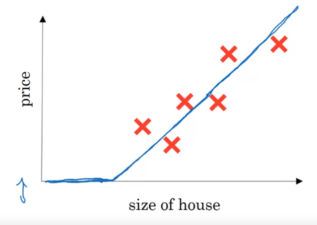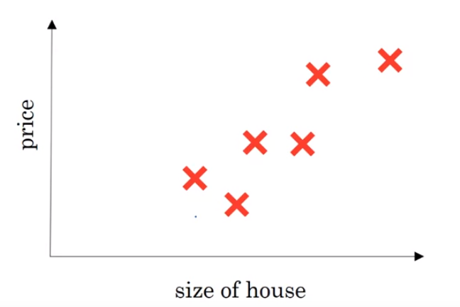 빨간색 X는 데이터를 표현한 것이다. 특정 house의 size에 따른 price를 좌표평면에 나타낸 것이고 위의 그림에서는 6개의 sample이 있다. 이 경우에 데이터들을 바탕으로 선형 회귀(linear line)가 가능하다. 선형 회귀란, 알려진 데이터를 바탕으로 선형으로 수학적으로 모델링하여 알 수 없는 데이터의 값을 예측하는 데이터 분석 기법이다.