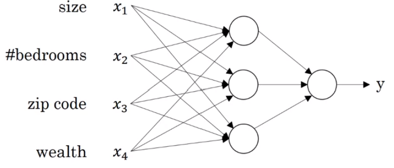 price를 예측하기 위해 영향을 끼치는 요소들은 size, bedroom의 개수, zip code, wealth가 있다. 즉, input layer에 4개의 input unit이 있고, output layer에 price라는 1개의 output unit, 중간에 hidden layer가 있다. 이들은 fully connected 되어 있다.