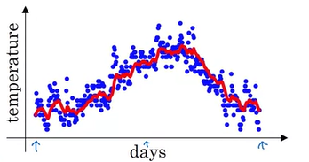 앞서 봤던 예시에서 β = 0.9 일 때 exponentially weighted average 를 plot 해보면 아래와 같다고 했었다.