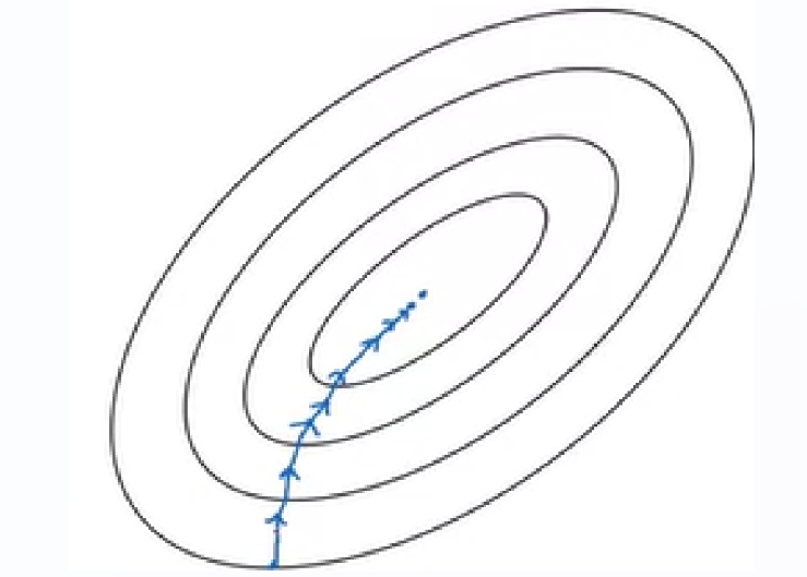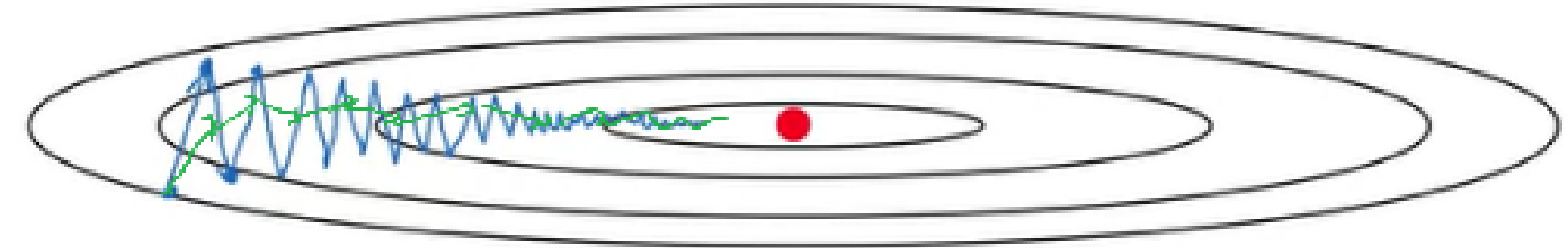 cost function 을 optimize 하는 과정을 살펴보자. 아래 그림과 같이 global minimum (빨간점) 에 도달하는 과정에서 느리게 진동을 하게 된다.