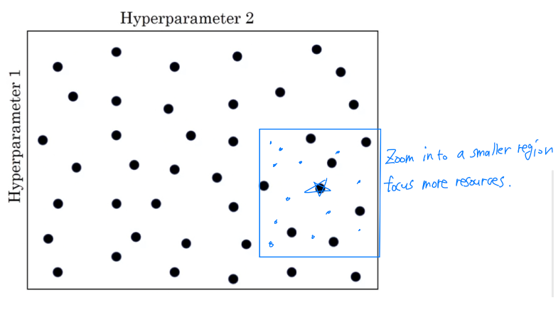 2차원의 hyperparameter 예시들이 있다고 해보자. 실제로 training을 하면서 어떠한 point 들이 잘 동작하는지 알게 될 것이다. 이러한 point 들 주변에 다른 몇몇 point 들도 잘 동작하는 경향이 있다. 그래서, 이러한 point 들을 hyperparameter의 작은 region 으로 zoom in (grouping) 해서 이 region 에 대해서 더 세밀하게 탐색하는 것을 의미한다.
