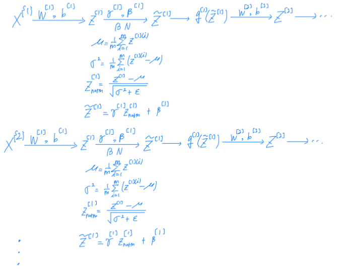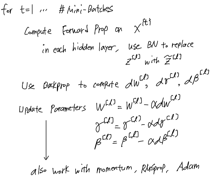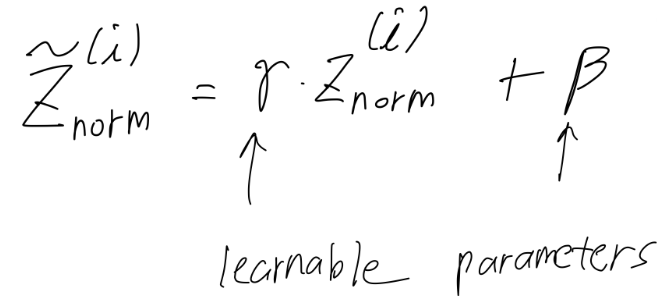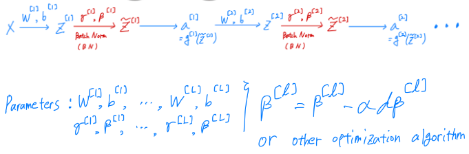 그래서 이제 이 γ와 β는 알고리즘의 새로운 parameter 가 된다. γ와 β 매개변수는 단순히 gradient descent 만을 사용해서 업데이트하는 것이 아니라, Momentum, RMSprop, Adam과 같은 optimizer 를 사용하여 업데이트할 수도 있다.