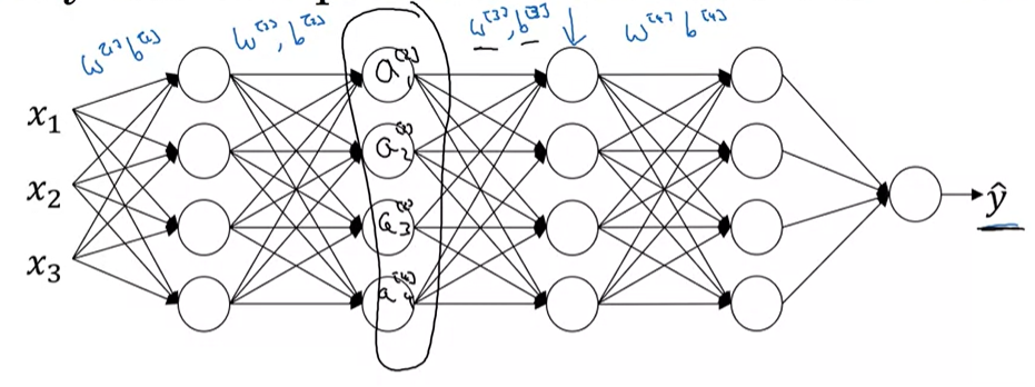 신경망의 학습 과정을 third hidden layer 의 관점에서 살펴보면, 이 네트워크는 W^[3]와 b^[3] 를 학습한다. 세 번째 hidden layer 의 관점에서 보면, 이전 layer 에서 전달된 일련의 값을 받아서 output ŷ 이 true value Y와 가까워지도록 처리해야 한다.