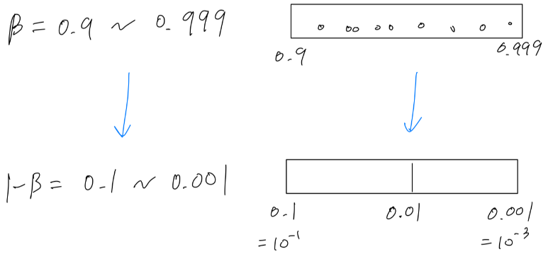 왜냐하면, β 가 1에 가까운 경우에 되게 예민하기 때문이다. 예를 들면, 0.9000 에서 0.9005 로의 변화는 미미하지만, 0.999 에서 0.9995로의 변화는 크다. 그래서 1에 가까운 region에 대해서는 더 densely 하게 sample 하도록 하기 위해서 log scale을 사용한다.