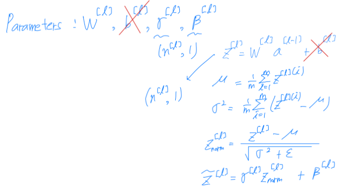 Batch Norm 는 mini-batch 를 보고 Z^[l] 을 먼저 평균과 표준 편차로 정규화한 후, β와 γ로 rescale 한다. 여기서, b^[l] 의 값이 실제로는 그냥 빼지게 된다. 왜냐하면 Batch Norm 단계에서는 Z^[l] 의 평균을 계산하고 그 평균을 빼기 때문이다.