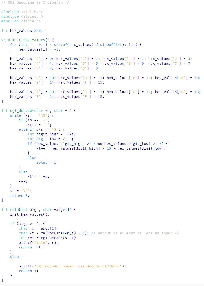 여기서는 입력 소스(s)와 출력 대상(t)을 위한 포인터를 사용한 cgi_decode()의 실제 구현이 있다.