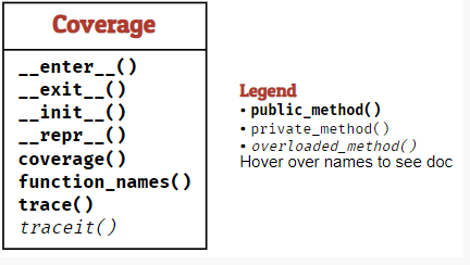 Coverage 객체를 print하면 cover 된 function 이 표시되며, cover 되지 않은 줄 앞에는 # 이 붙는다.