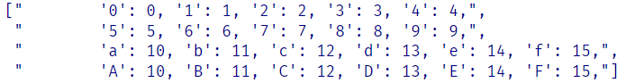 'a': 10, 'b': 11, 'c': 12, 'd': 13, 'e': 14, 'f': 15,