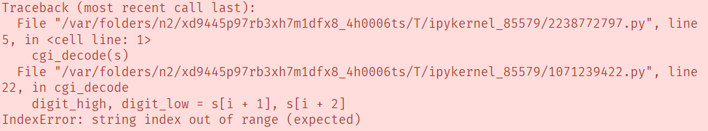 문제는 문자열 끝에 있다. '%' 문자 이후에 구현은 항상 두 개의 (16진수) 문자를 액세스하려고 시도하지만, 만약 존재하지 않으면 IndexError 예외가 발생한다.