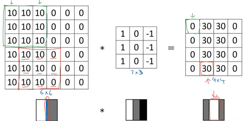 3x3 filter (kernel) 와의 convolution 를 통해 vertical edge를 detect할 수 있다. 4x4 가 된다. (element-wise)