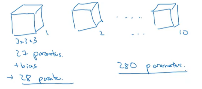 하나의 filter를 먼저 살펴보면, 각 filter는 3x3x3=27 parameters와 1개의 bias가 존재하며, 따라서 하나의 filter에는 28개의 parameter가 존재한다. 따라서, 총 280개의 파라미터가 존재하게 된다.