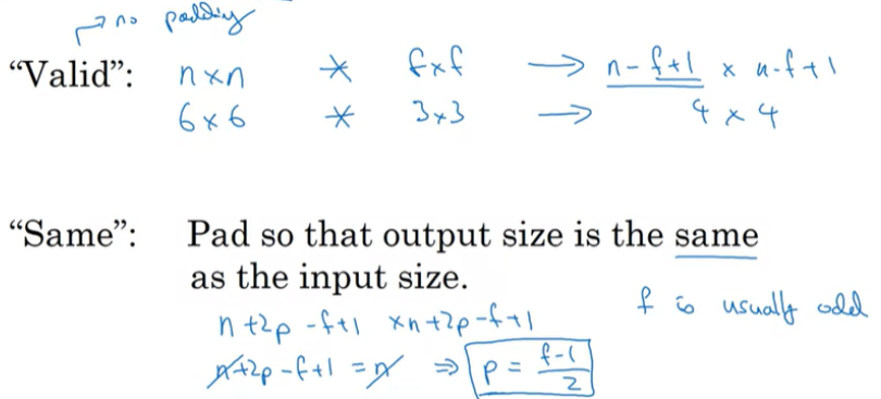 Same Convolution에 대해서 조금 더 살펴보면, input image가 (n, n), filter가 (f, f), 그리고 padding을 p만큼 적용한다면, output matrix는 (n+2p-f+1, n+2p-f+1)이 된다. 우리는 이 size가 input과 동일하도록 만들기 위해서 방정식으로 정리하면, p=(f−1)/2 로 나타낼 수 있다.