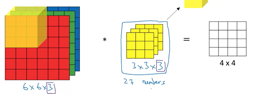 지금까지 2D에서의 convolution 연산을 살펴보았고, 이제는 3D volume에서 어떻게 conv연산을 수행하는지 살펴보자.