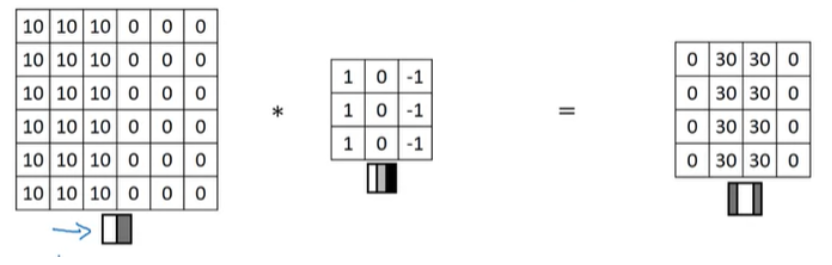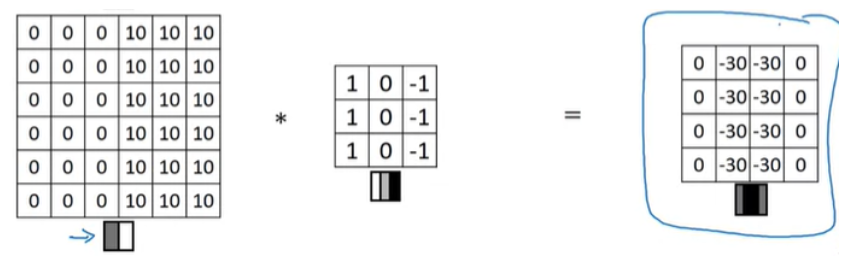 전환되는 명암이 반대가 되기 때문에, 위와 같이 conv 연산 결과값이 -30으로 나타나게 된다. 이것은 edge가 어두운 색에서 밝은 색으로 변환한 것을 감지했다는 의미이고, 만약 positive나 negative를 신경쓰지 않는다면, output matrix에 절대값을 얻어서 사용하면 된다.