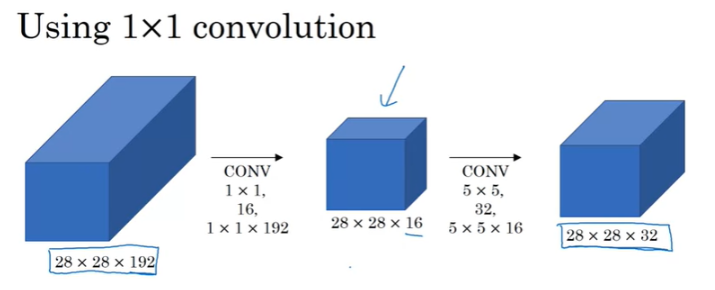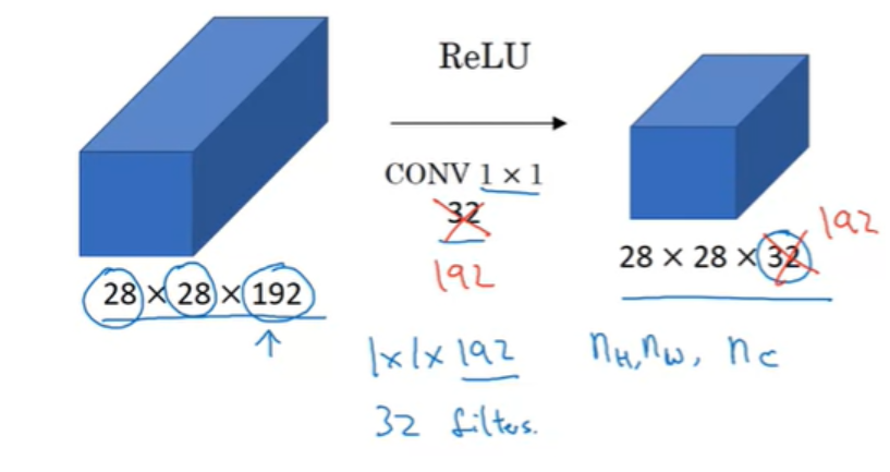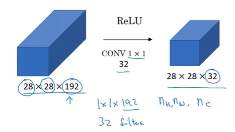 채널이 너무 많아서, 채널을 줄이고 싶다면(28x28x32로), 32개의 1x1 filter를 사용하면 된다. 각각의 filter는 1x1x192이다.