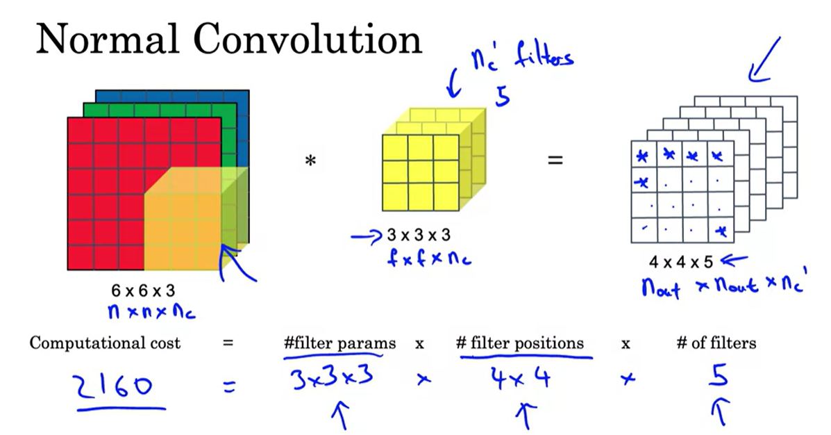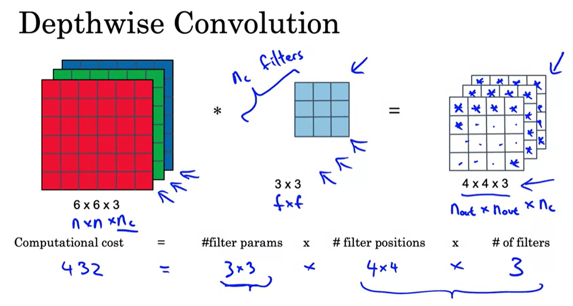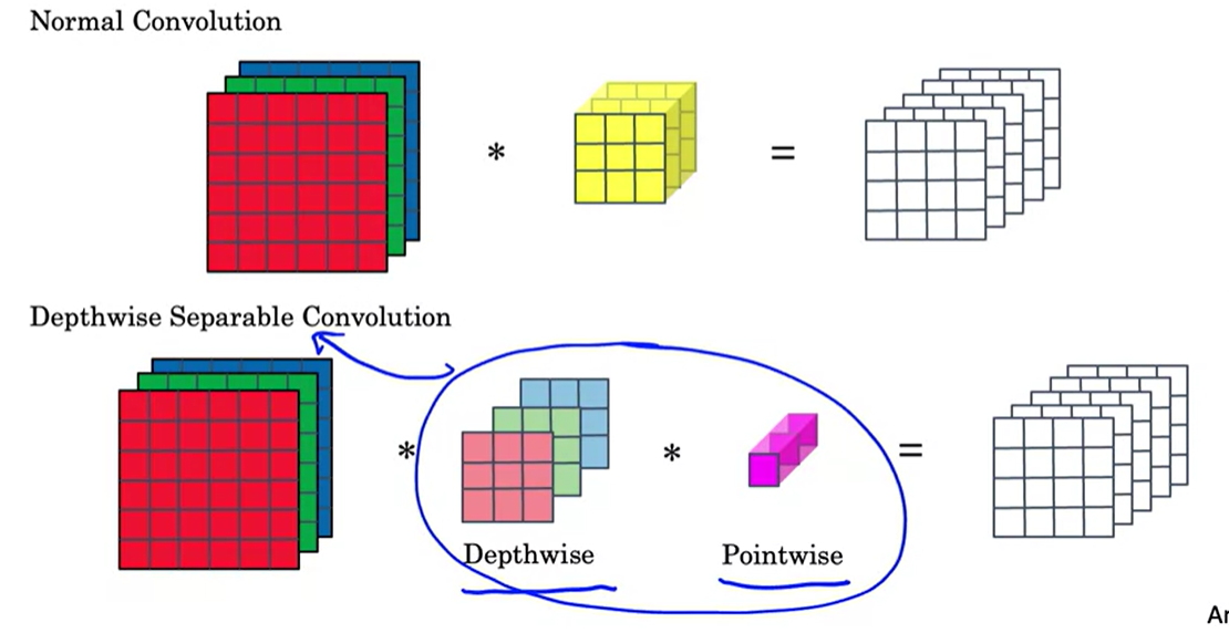 지금까지 설명한 신경망들은 상당히 비용이 많이 든다는 것을 알 수 있다. 배포 시에 사양이 낮은 CPU, GPU 를 가진 device 로 neural network 를 실행하고자 하기 위해서 도입된 개념이다. 여기서는 depthwise separable convolution 을 사용한다. normal convolution 과 비교해보자.