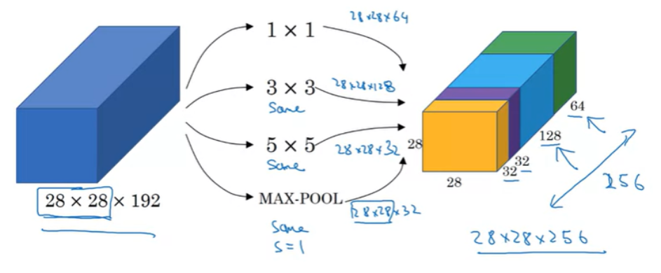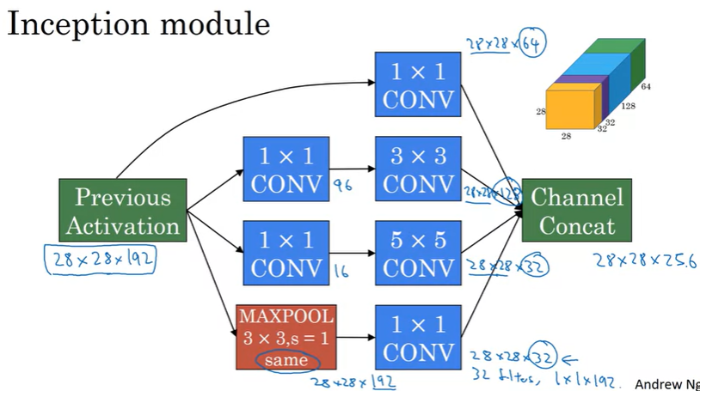 Inception Module은 아래과 같이 구성되며, input은 이전 layer에서 나온 activation을 사용한다. 방금 보았던 28x28x192를 input으로 사용해보자.